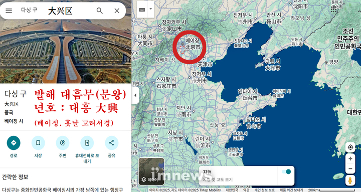 [ 고구리가 망한 후, 그 자리에서 건국한 발해는 현재 베이징에 수많은 발해 지명이 있고, 우측 바다는 발해만으로 불린다.]