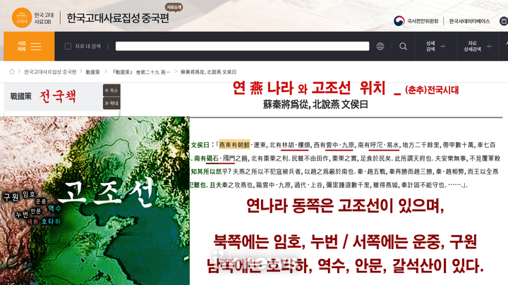 춘추전국 시대 <전국책>에는 산서성의 연(燕)나라의 우측에 고조선이 존재하는데,