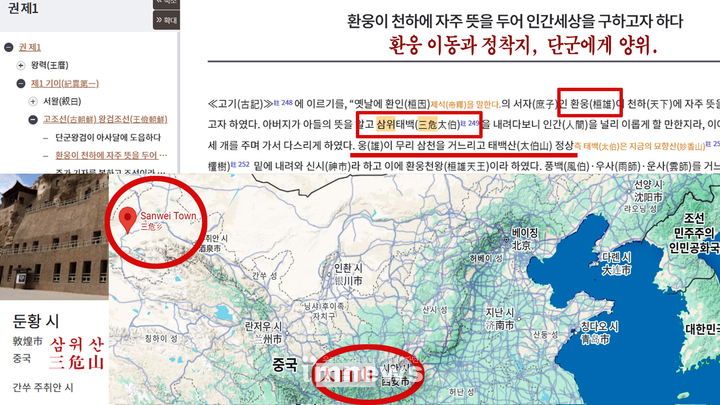 현재 삼위산은 감숙성 돈황에, 태백산은 병마용과 피라미드 무덤이 잔뜩 있는 시안(西安) 부근에 잔뜩 존재하며, 태행산맥으로 이어지고, 베이징을 지나