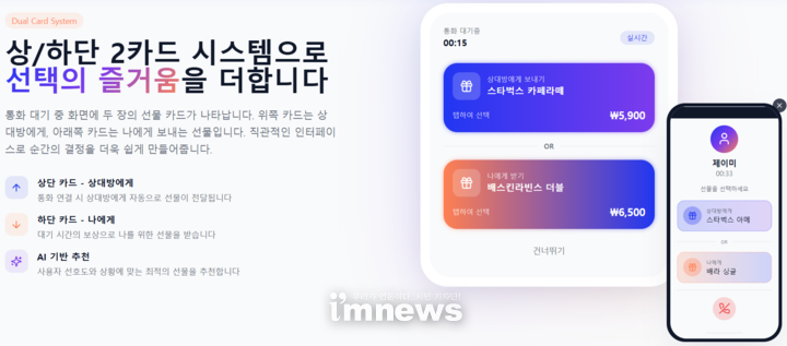 플랫폼의 핵심은 전화 발신 직후 통화 연결 전까지의 짧은 시간 동안 사용자 화면에 알고리즘 기반 숏폼 콘텐츠와 함께 상단 및 하단 두 개의 상품 카드가 노출된다는 점이다. 발신자는 해당 상품 중 하나를 선택해 상대방에게 선물로 전송하거나, 본인에게 적립하는 방식으로 활용할 수 있다. 수신자는 선물 수령을 위해 앱 설치 후 간편 가입 절차를 거치며, 이후 선물을 즉시 사용하거나 보관, 포인트 전환, 재전송하는 방식으로 자산화할 수 있다.