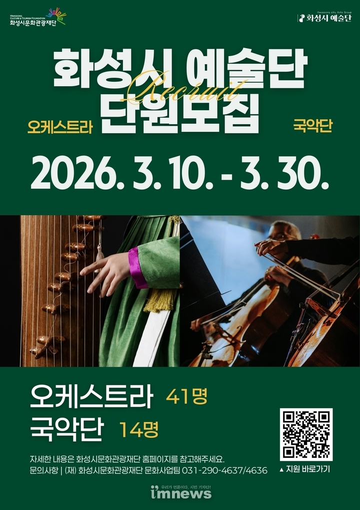 화성시문화관광재단(대표이사 안필연, 이하‘재단’)은 2026년 ‘화성시 예술단’을 이끌어갈 오케스트라 및 국악단 단원을 모집한다.