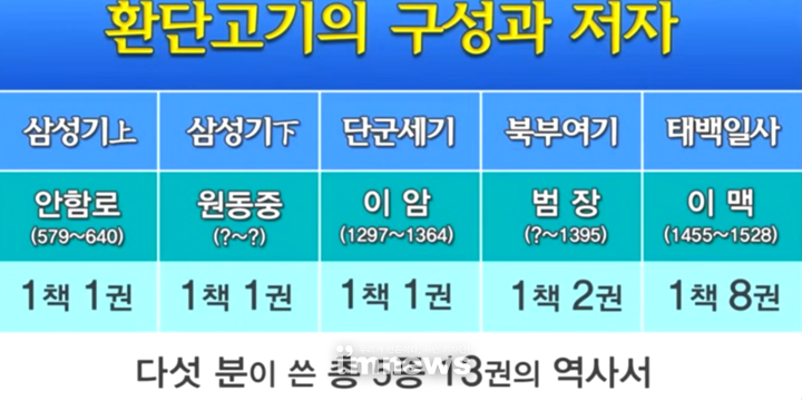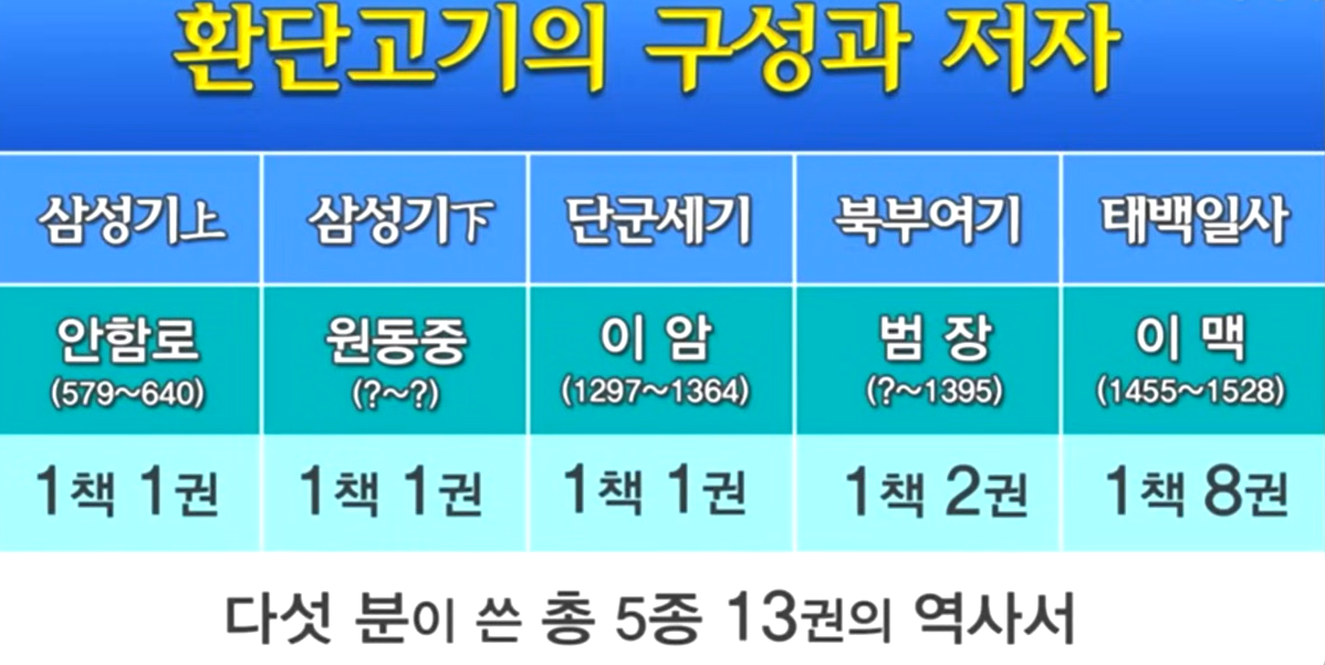 삼성기(상) 1권, 삼성기(하) 1권, 단군세기 1권, 북부여기 2권, 태백일사 8권, 이렇게 5명이 쓴 5종 13권 역사서