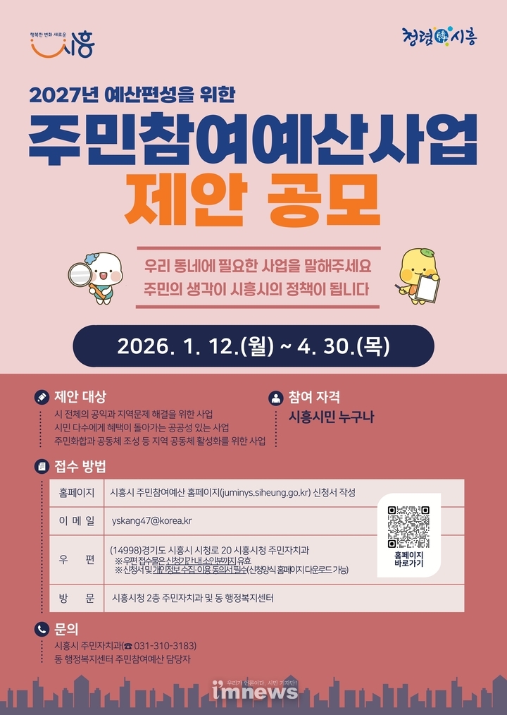 공모 관련 궁금한 사항은 시흥시 주민자치과(031-310-3183)나 각 동 행정복지센터 주민참여예산 담당자에게 문의하면 된다.