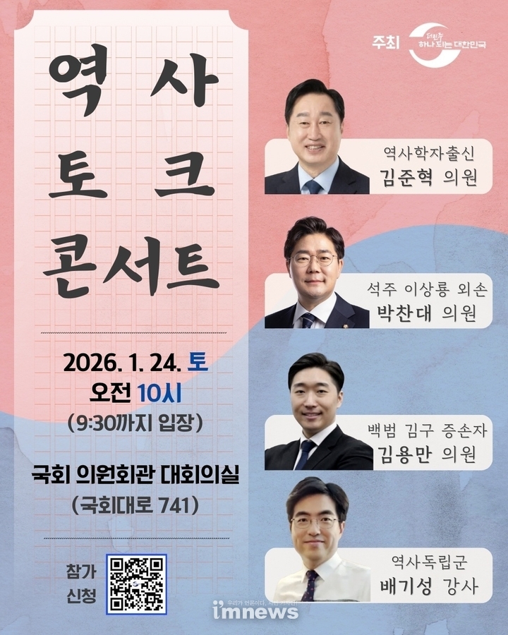1월 24일 토요일에 국회의원 회관 대 회의실 에서 역사 학자 출신 김준혁 의원과 석주 이상룡 외손 박찬대 의원, 백범 김구 증손자 김용만 의원, 역사 독립군 배기성 강사가 하는 역사 토크 콘서트 를
