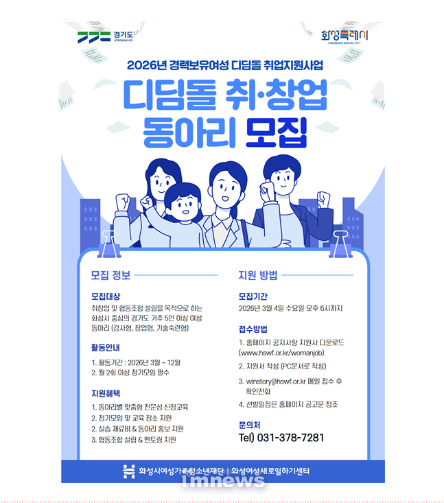 (재)화성시여성가족청소년재단(대표이사 염미연) 화성여성새로일하기센터는 ‘2026년 경력보유여성 디딤돌 취업지원사업’의 일환으로 취·창업 동아리를 모집한다. 모집 기간은 2월 5일부터 3월 4일까지다.