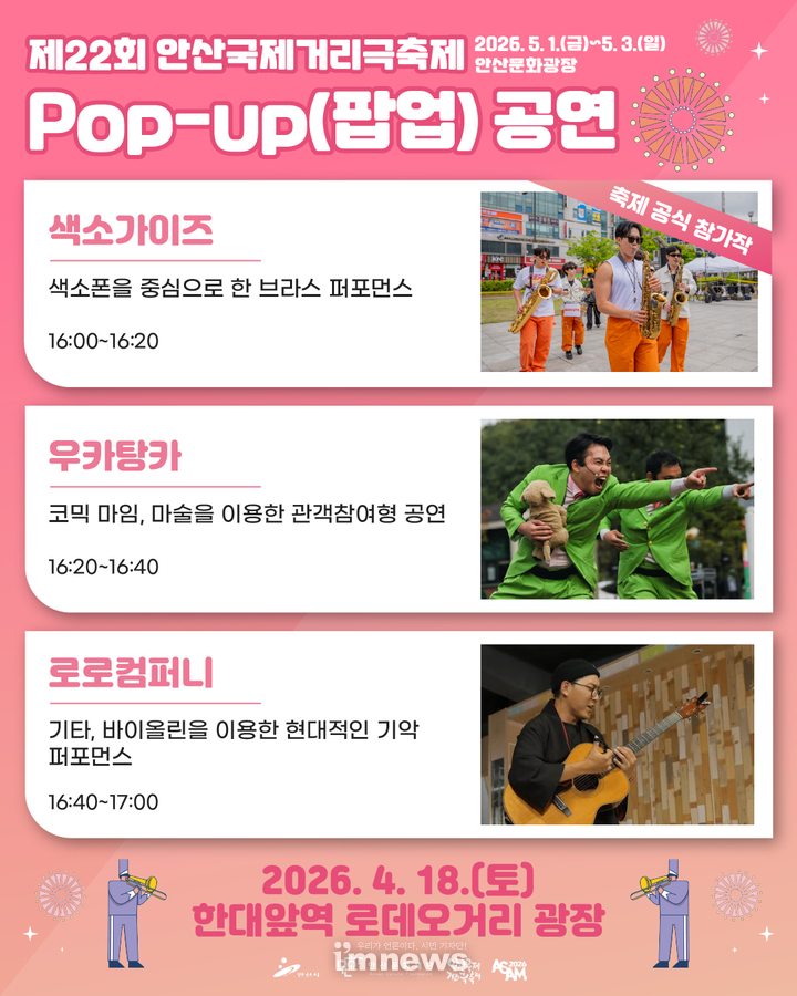 이민근 안산시장은 “팝업공연을 통해 시민들이 거리예술을 일상에서 접하고, 축제를 미리 체감하는 시간이 되길 바란다”며 “앞으로도 지역 상권과 연계한 축제 운영을 지속해 나가겠다”고 말했다.