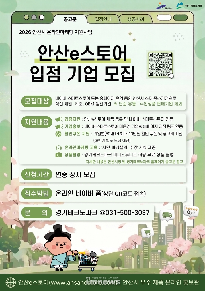 입점 대상은 네이버 스마트스토어 또는 자체 누리집을 운영하는 안산시 소재 중소기업과 소상공인 가운데 직접 개발·제조하거나 주문자상표부착생산(OEM) 방식으로 생산하는 기업이다. 단순 유통·수입 상품 판매 기업은 제외된다.