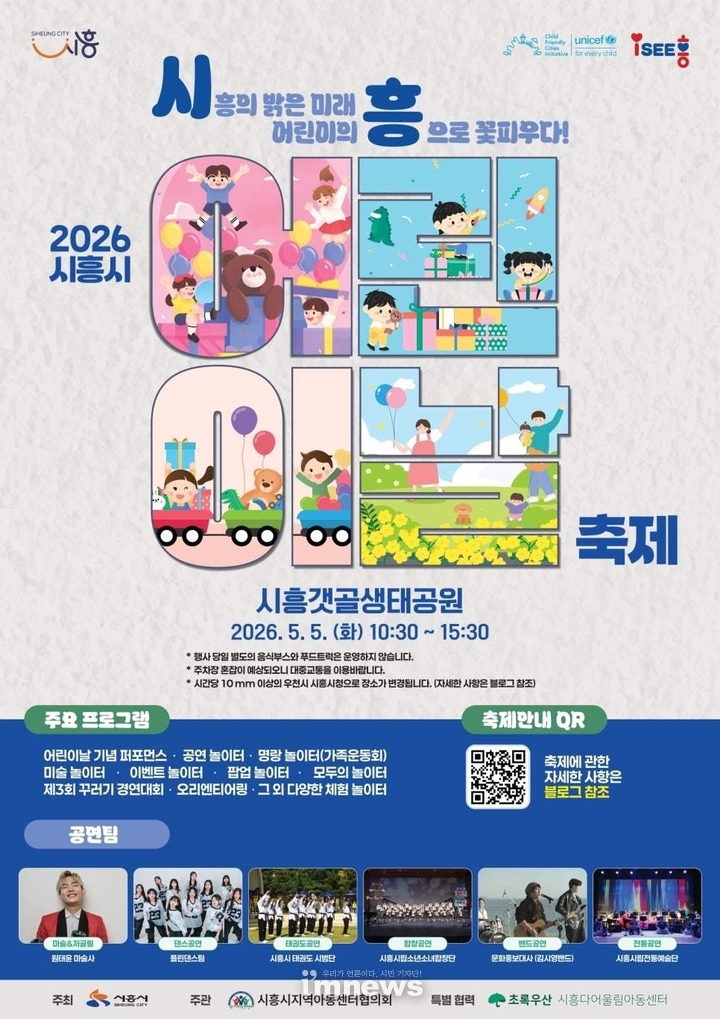 행사는 오전 10시 시흥시립소년소녀합창단과 김시영 밴드의 활기찬 식전 공연으로 문을 연다. 이어 기념식에서는 어린이 헌장 낭독과 함께 어린이와 내빈이 참여하는 슬로건 퍼포먼스를 통해 어린이날의 의미를 되새기며, 원태윤 마술사의 마술&저글링 축하 공연이 어린이들을 환상의 세계로 안내할 예정이다.